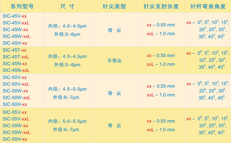 ●針桿彎曲角度0 - 45,針尖至肘長度0.55毫米或1.0毫米。
