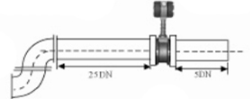 | 5.不同平面兩個彎管的安裝 如果流量計的前端有兩個90°彎頭,要保證流量計的前直管段≥25D,后直管段≥5D | ![]() | |||||||||||