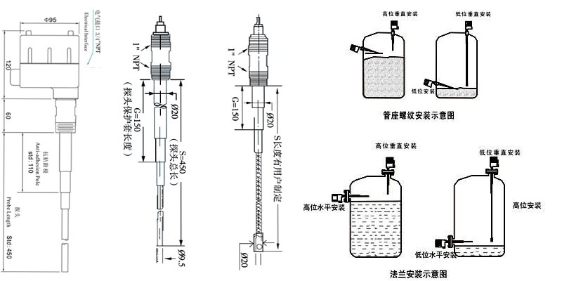 四、射頻導(dǎo)納物位計(jì)外形尺寸圖及安裝示意圖: