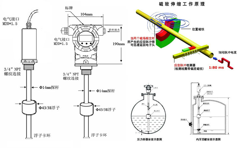 五、磁致伸縮液位計原理圖及安裝示意圖: