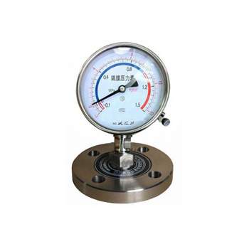 隔膜式壓力表由各種通用型壓力儀表和不同結(jié)構(gòu)的隔膜隔離器組成一個封閉系統(tǒng),內(nèi)充密封液。當(dāng)被測介質(zhì)的壓力作用于隔膜時,則隔膜產(chǎn)生變形,壓縮封閉系統(tǒng)中的密封液。由于密封液的固有性質(zhì),使壓力儀表中的彈性元件產(chǎn)生相應(yīng)的彈性變形—位移,經(jīng)指示裝置顯示壓力值。當(dāng)隔膜的剛度足夠小時,則壓力儀表指示的壓力就近于被測介質(zhì)的壓力值。